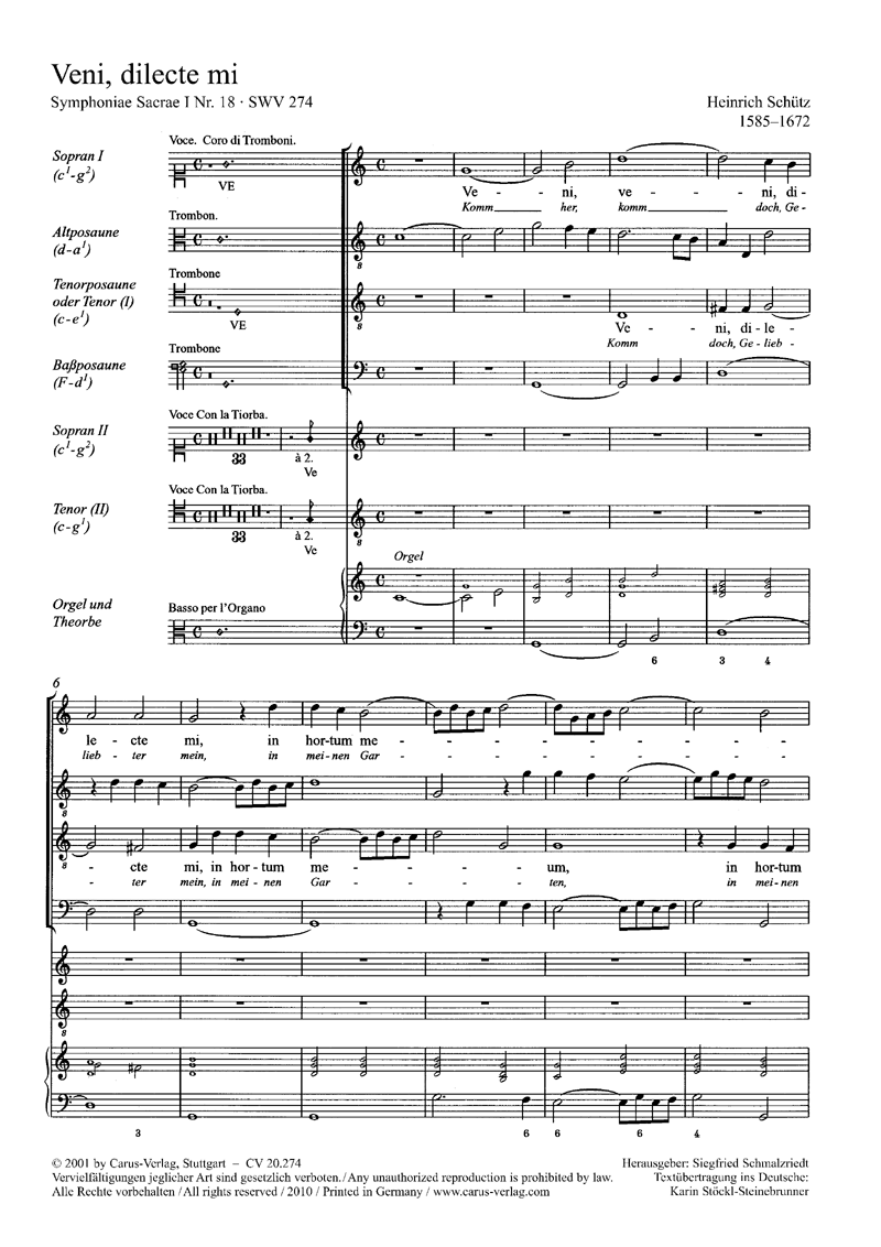 Veni dilecte mi (VoSossT; 3 trombónes; optional; T; 2 trombónes; ]; Bajo cifrado; theorbo), partitura