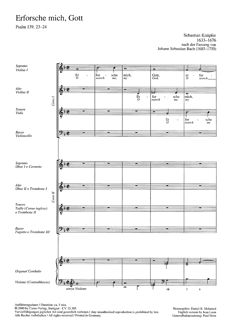 Erforsche mich Gott (coro SATB; soprano, contralto, tenor, bajo; optional; Instr; ]; Bajo cifrado), partitura coral