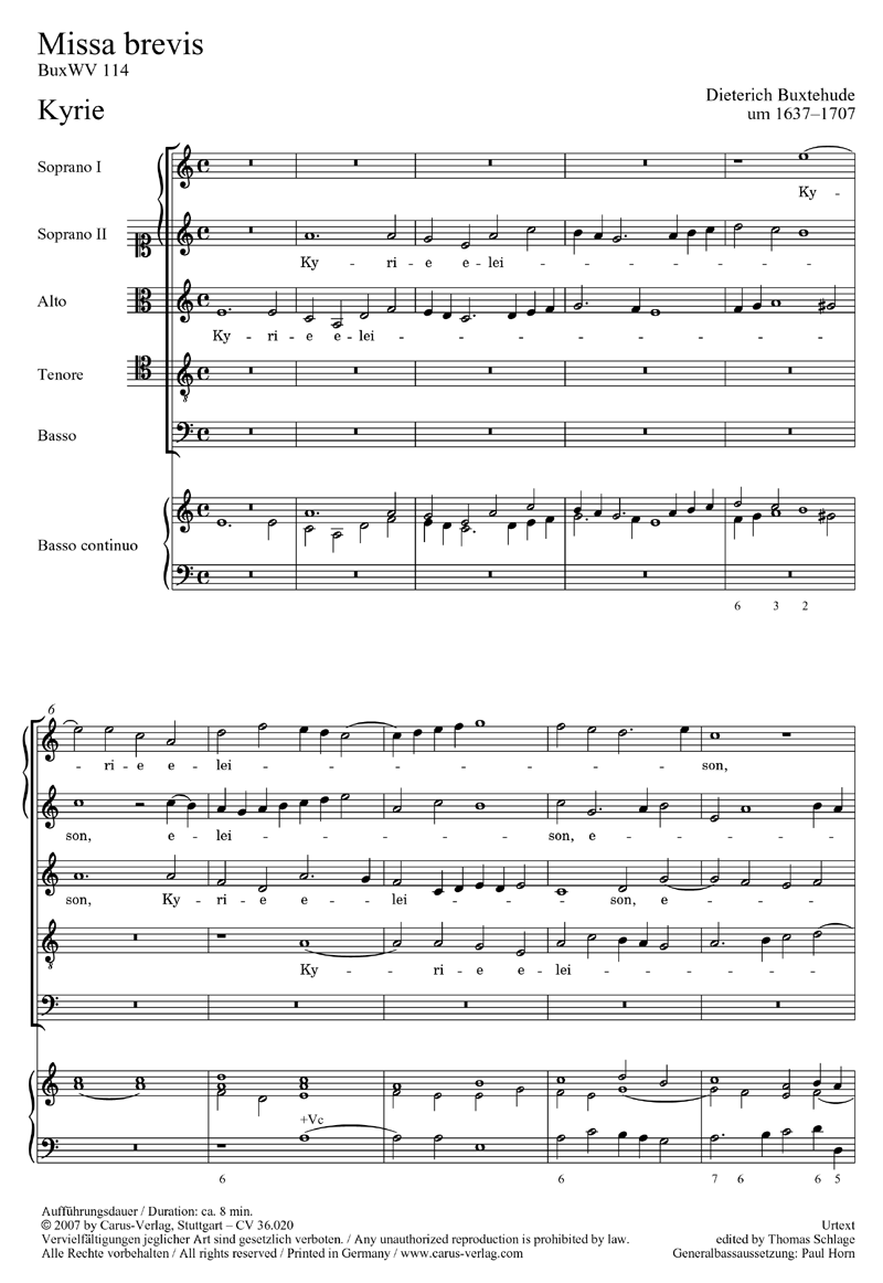 Otros detalles/contenidos In der Tradition der protestantischen Missa-brevis-Komposition steht die Vertonung der vorliegenden Messe, die im sogenannten 'stile antico' gehalten ist, der sich an Kompositionsmodellen des 16. Jahrhunderts orientiert und als Palestrina-Stil bekannt ist. Die Abschrift, auch sie liegt in der Düben-Sammlung, entstand im Jahr 1675. Die strenge Form des 'stile antico', kontrapunktische Polyphonie ohne Begleitinstrumente, hat Buxtehude für verschiedene Kompositionen gewählt, die in dieser Zeit entstanden sind, etwa Mit Fried und Freud ich fahr dahin BuxWV 76, die Trauermusik zum Tod seines Vaters. Die Missa brevis umfasst Kyrie sowie Gloria des Ordinariums und ist damit eine 'Lutherische Messe', da im protestantischen Gottesdienst des 17. Jahrhunderts diese Messe-Teile lateinisch vorgetragen wurden.