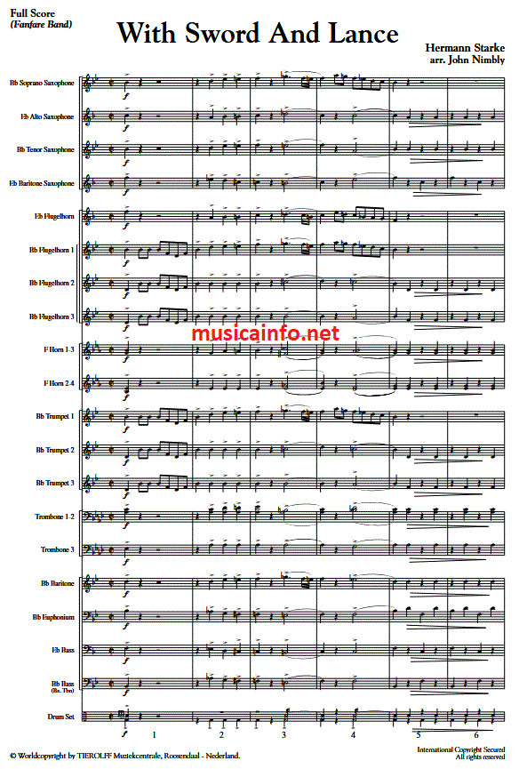 Otros detalles/contenidos Con Espada Y Lanza es la marcha con la que Hermann Starke (1870-1920) no sólo ganó el primer premio en un concurso internacional en 1912, sino que estableció su reputación como compositor. Starke compuso numerosas obras para orquesta de viento, pero todas cayeron en el olvido. Esta marcha es la excepción. John Nimbly, con total respeto por el original, ha arreglado la partitura para la orquesta de viento actual y ha añadido las partes que faltaban.