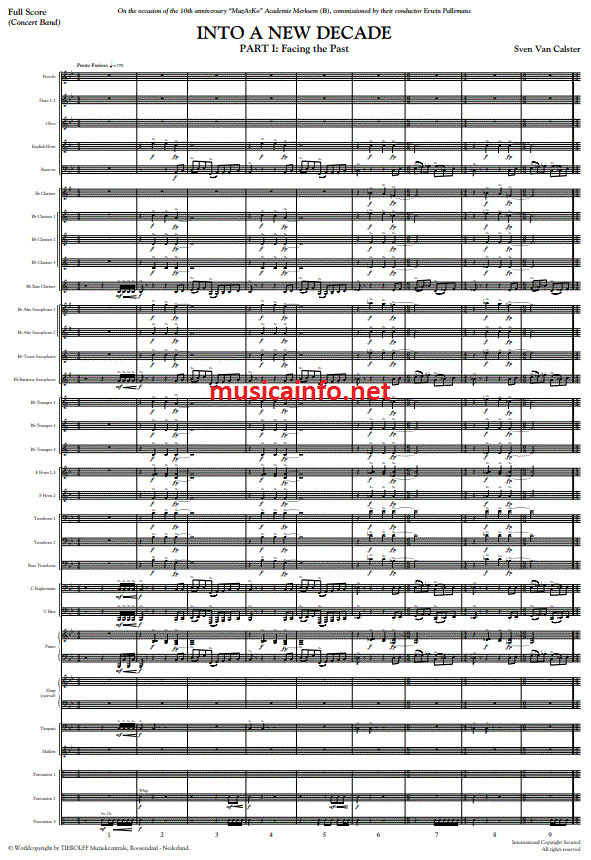 Otros detalles/contenidos "Into a New Decade" se escribió para el décimo aniversario de "MuZarKo", la orquesta de viento de la Academia de Música de Merksem (Bélgica). La obra consta de tres partes y está orquestada de tal manera que cada grupo instrumental recibe un reto suficiente. Los pasajes solistas se alternan con grandes pasajes de tutti, y las secciones rítmicas con compases desafiantes se alternan con secciones melódicas conmovedoras.