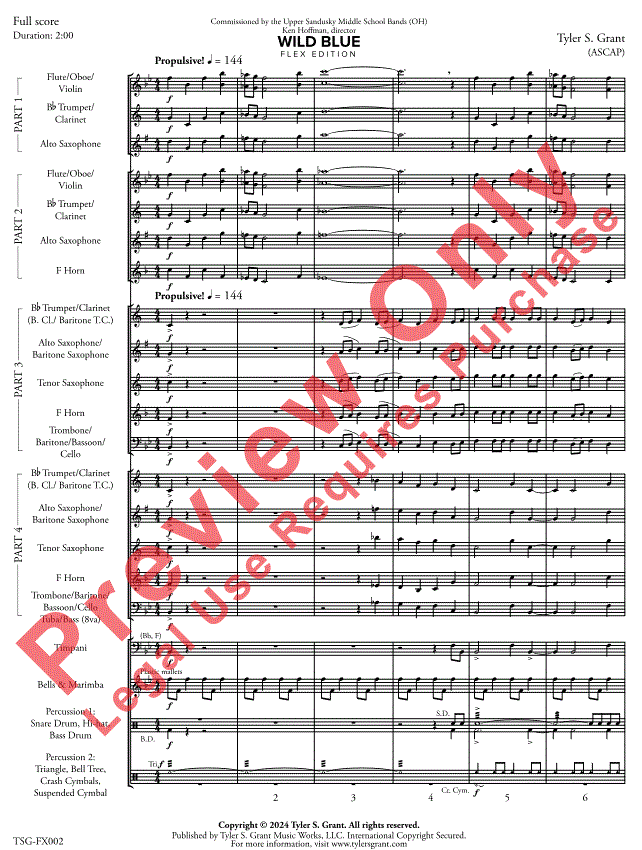 Otros detalles/contenidos ¡Pónganse los cascos y vuele con la última fanfarria de Tyler S. Grant para bandas jóvenes, Wild Blue! Escrita para una instrumentación flexible, esta obra se distingue de otras de este nivel por sus ritmos y armonías cautivantes. Hay guías complementarias de ritmo y melodía disponibles para ayudar en el proceso de enseñanza. ¡Una apertura perfecta para su próximo concierto!