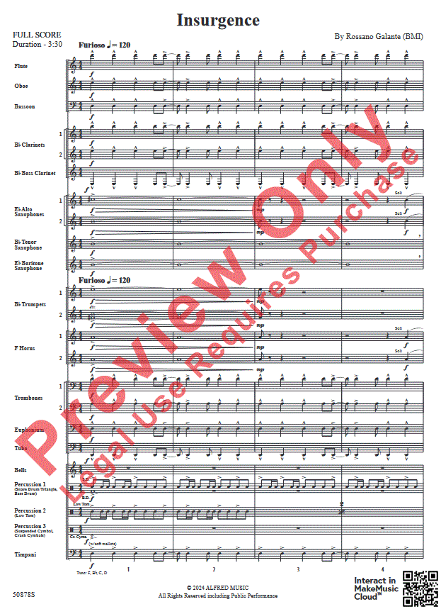 Otros detalles/contenidos “Insurgence” de Rossano Galante comienza con un ostinato rítmico y contundente en instrumentos de viento de madera, metales bajos y percusión. En este entorno post-apocalíptico, las líneas de bocina agresivas y altísimas toman la delantera. Este tema pasa a las trompetas, luego a los instrumentos de viento, quienes anuncian su presencia en esta obra. La pieza pasa a una sección ligeramente lírica que captura el dolor y la lucha que estas personas soportan durante estos tiempos difíciles. La pieza recapitula el tema principal con el conjunto completo, llevando esta composición a una conclusión atronadora.