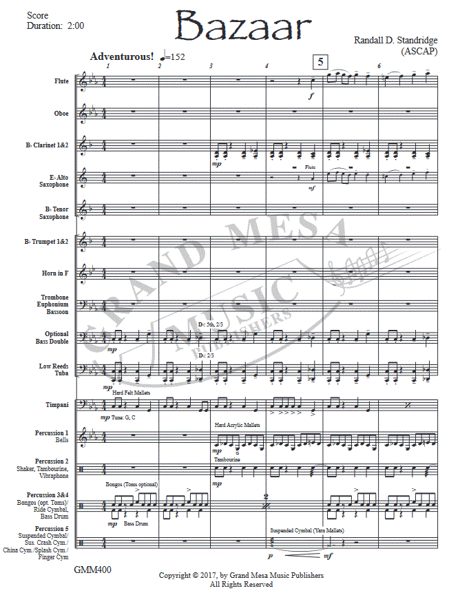 Otros detalles/contenidos Bazaar lleva al oyente a un viaje musical a los exóticos mercados de Oriente Medio. Especias, hermosas telas y tesoros invaluables llenan los puestos mientras el ruido, los aromas y las risas llenan el aire. El uso de una escala alterada y una percusión colorida se suman a la sensación exótica de esta obra, ¡lo que la convierte en un emocionante viaje musical que sus estudiantes desearán tocar a diario!