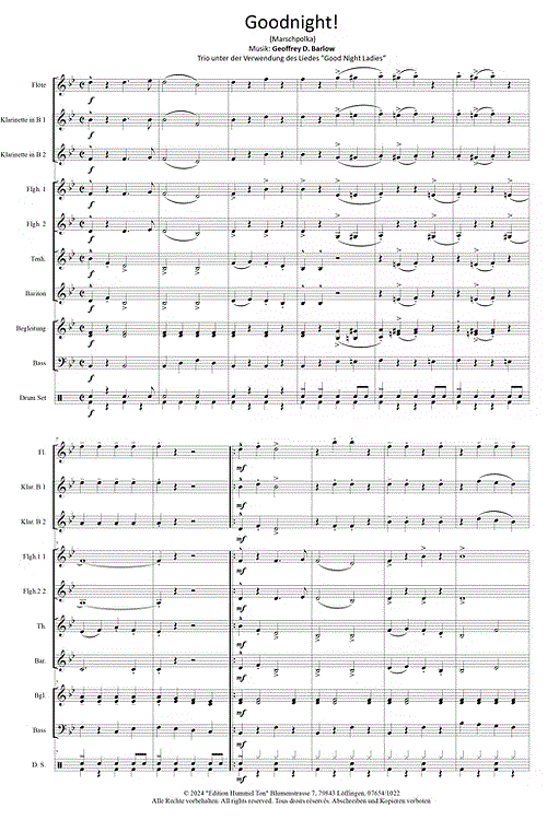 "Goodnight" ist eine sehr leichte Marschpolka aus der Serie "Nimm"s leicht" von Geoffrey D. Barlow und verwendet im Trio das bekannte Traditional "Good night ladies". Es ist der ideale Titel um ein Konzert zu beenden. Gerne kann bei dem Lied auch mitgesungen werden! |