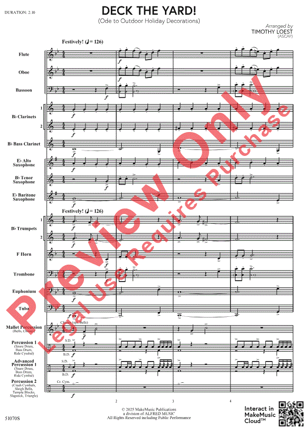 Este encantador popurrí de Timothy Loest captura el espíritu navideño y rinde homenaje a la decoración festiva al aire libre. Ya sea disfrutando de "Up on the Housetop" o viendo el desfile de los soldaditos de madera del vecindario, el público disfrutará de otras joyas como "Jolly Old St. Nicholas", "Deck the Halls" y "O Tannenbaum". ¡"Deck the Yard!" también ofrece la oportunidad de usar decoración navideña en el lugar de la presentación o proyectar fotos de las casas del vecindario. |