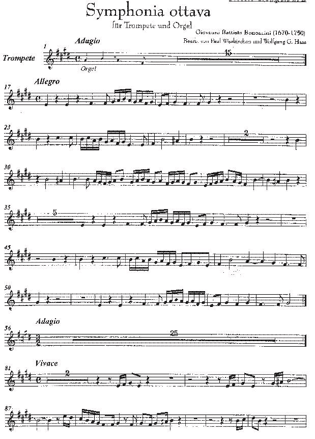 Das Stück besteht aus 6 kurzen Sätzen in der Folge: Adagio, Allegro, Adagio, Vivace, Adagio, (Allegro); Die Ausgabe ist in Originalfassung mit Trompete, 2 Violinen, 2 Violen, Violoncello und Basso Continuo erschienen. Die vorliegende Ausgabe ist eine Bearbeitung für Trompete und Orgel, wobei die Stimme für Trompete jeweils in A, D, C und B vorhanden ist. Denkbar ist auch eine Ausführung mit Oboe und Orgel. |