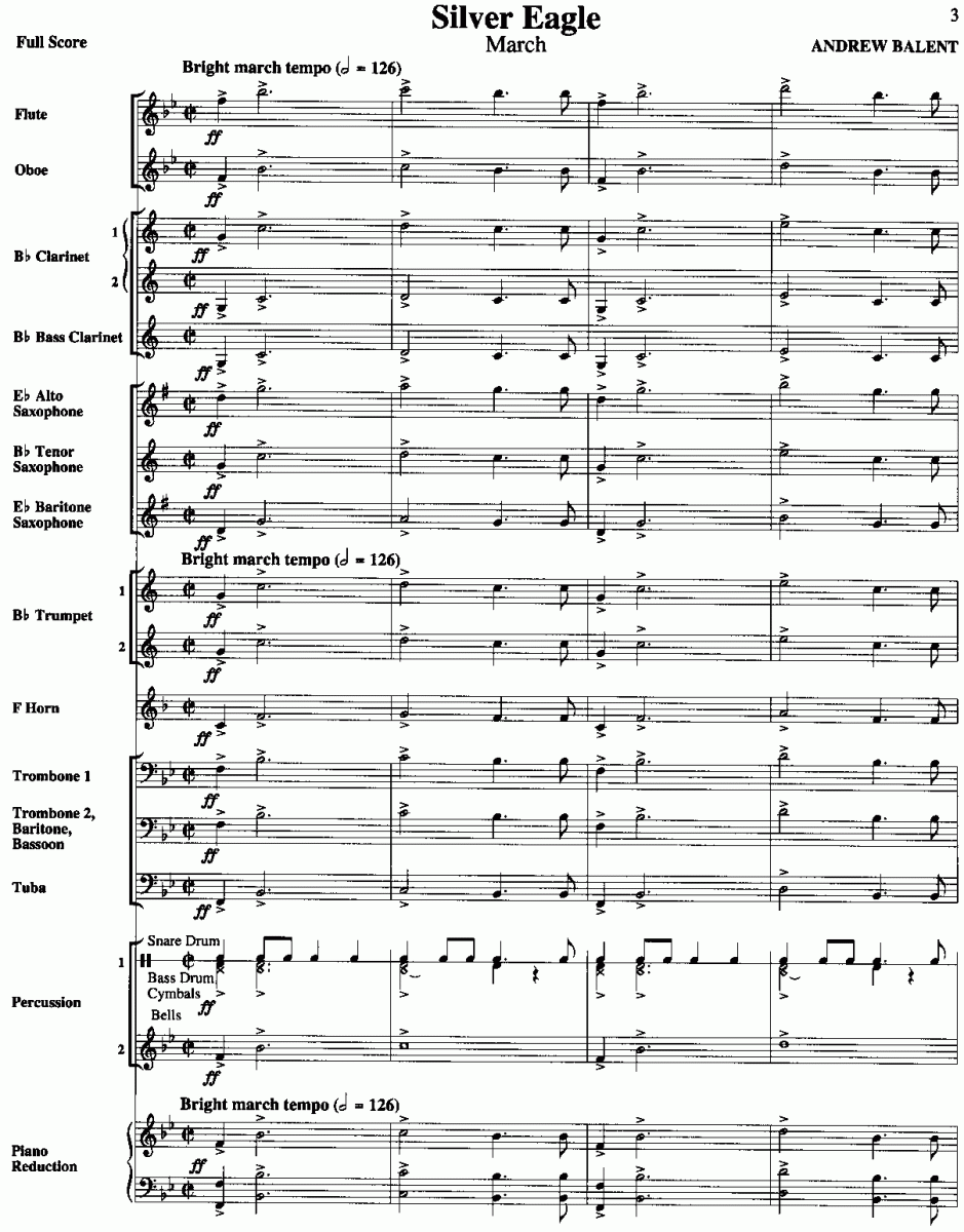 Otros detalles/contenidos Silver Eagle March fue escrita para la Banda "Silver Eagle" de Abbott Middle School de West Bloomfield, Michigan, por el 25 aniversario de su director, Mark Barton. Esta excelente marcha original presenta una puntuación llamativa y agradables contrastes entre el estilo marcato y el juego de legato. La tensión de trío en Eb (que está prefigurada en la introducción) presenta los clarinetes y los saxófonos en una melodía acabada de silbar. Esta marcha tiene todas las características de un concierto clásico.
